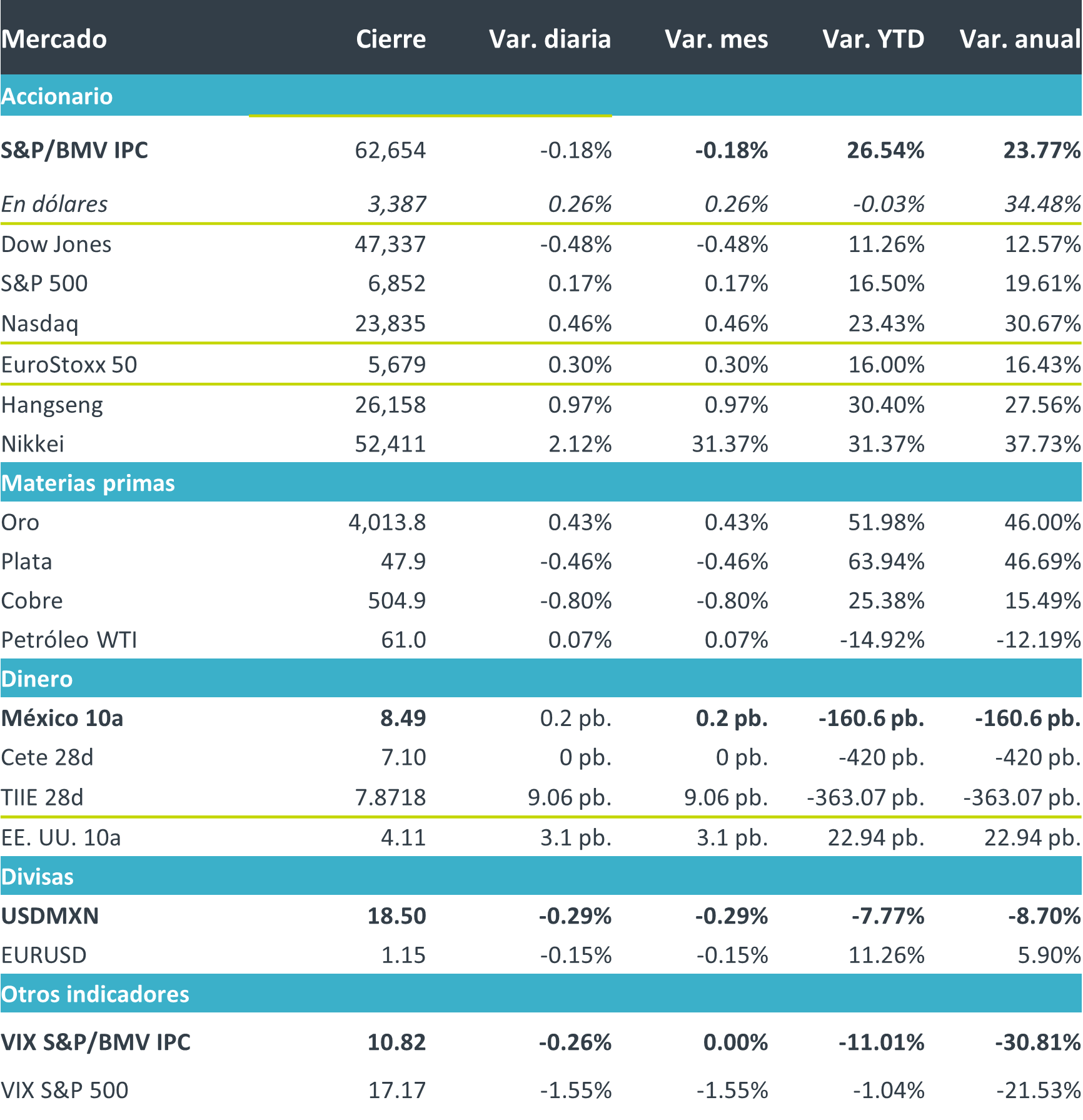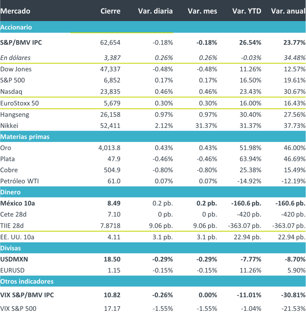 Mañana datos de confianza al consumidor, reservas internacionales y creación formal de empleo en México; en Estados Unidos, datos de balanza comercial y comentarios de Vicepresidenta de Supervisión de la Junta de Gobernadores del Fed, M. Bowman; y, en Europa, comentarios de la presidenta del BCE, C. Lagarde.