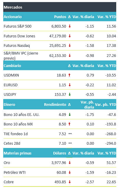 +Los futuros de los índices accionarios estadounidenses operan de forma negativa, después de que el reporte de Palantir no impresionara y conforme aumentan los pronósticos sobre una posible estabilización en los mercados accionarios, dadas las elevadas valuaciones, principalmente en empresas relacionadas con IA. Los índices en Europa operan a la baja (Euro Stoxx 50 -0.9%) y en Asia cerraron con retrocesos (NIKKEI japonés -1.7%). Materias primas, desde energía hasta metales, observan descensos generalizados, en línea con un entorno de mayor cautela. El rendimiento a 10 años de los bonos del tesoro baja y el índice dólar sube 0.2%, apoyados por una mayor demanda por activos seguros. En este contexto, el tipo de cambio se deprecia en el margen, oscilando durante la madrugada entre $18.49-18.65.