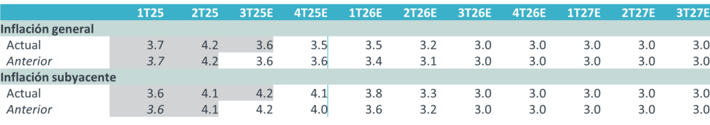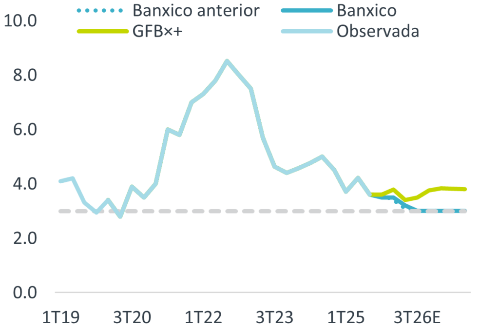 El banco central ajustó ligeramente su pronóstico de inflación general para los próximos trimestres, reiterando que la variable convergerá en el objetivo de 3% en el 3T26. Por su parte, la proyección para la inflación subyacente se incrementó por quinta ocasión consecutiva. Como en septiembre, el comunicado juzgó que el balance de riesgos se mantiene inclinado al alza, acotando que “es menos pronunciado” que en los años previos.
