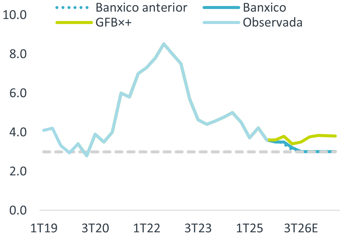 El banco central ajustó ligeramente su pronóstico de inflación general para los próximos trimestres, reiterando que la variable convergerá en el objetivo de 3% en el 3T26. Por su parte, la proyección para la inflación subyacente se incrementó por quinta ocasión consecutiva. Como en septiembre, el comunicado juzgó que el balance de riesgos se mantiene inclinado al alza, acotando que “es menos pronunciado” que en los años previos.
