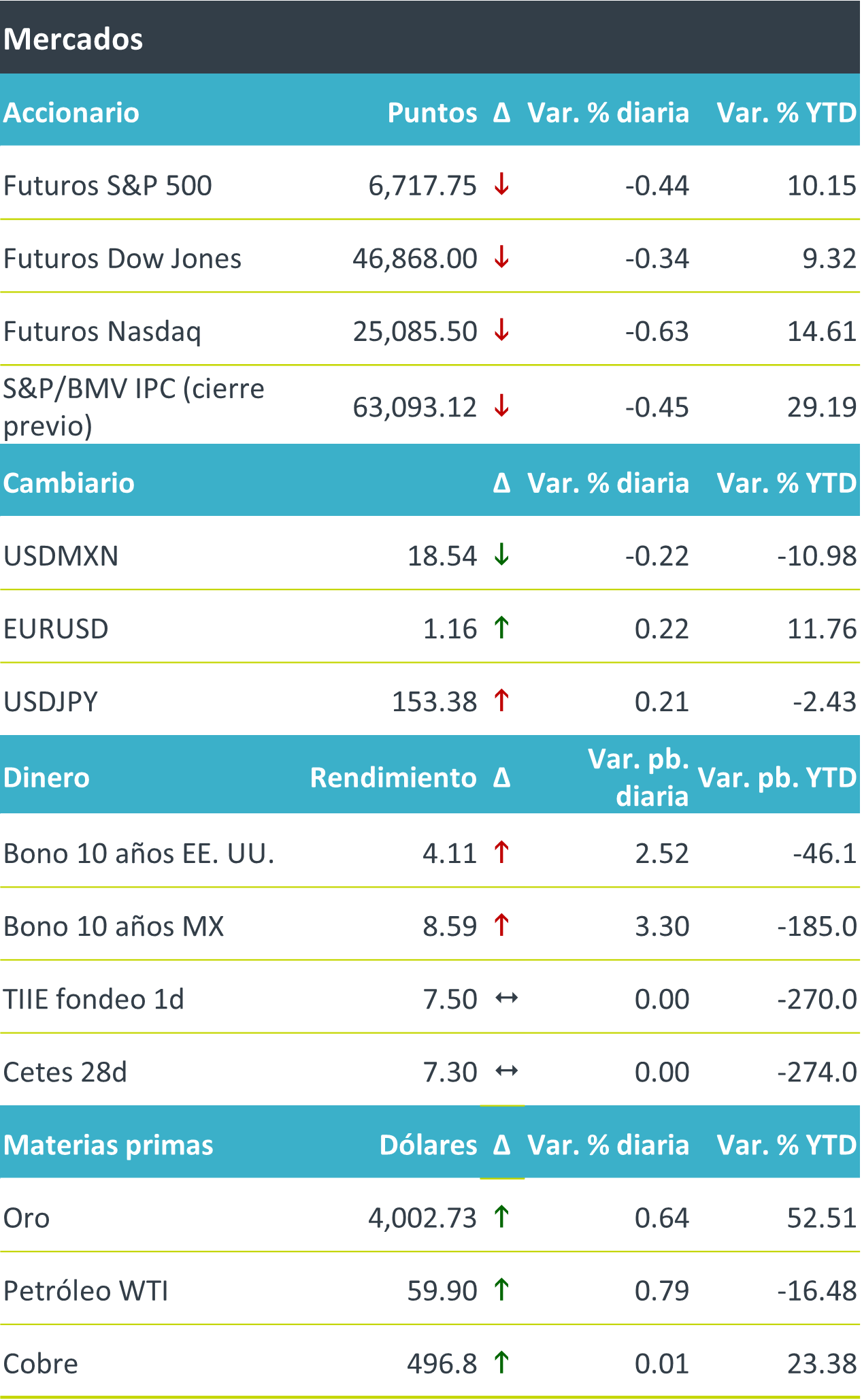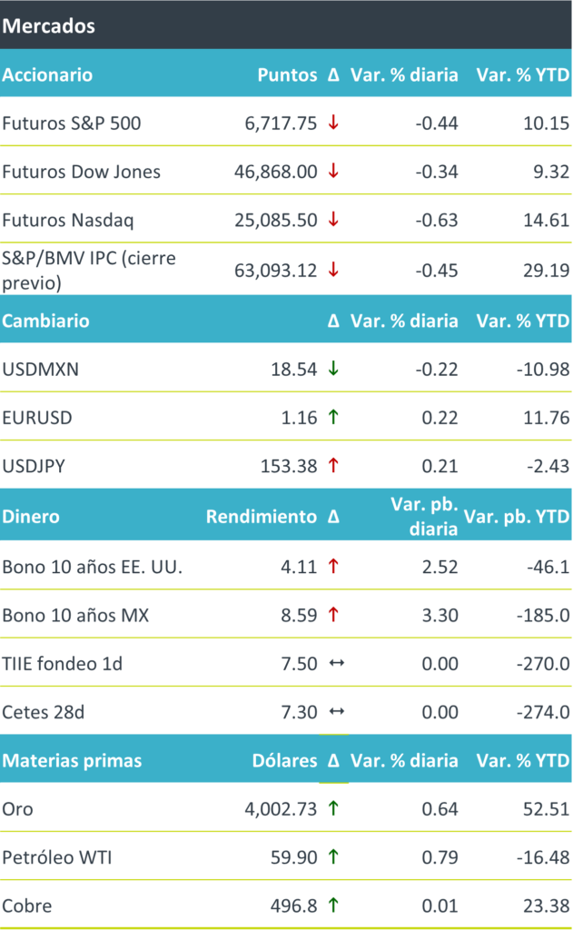 +Anticipamos una jornada volátil, ante la creciente preocupación por las altas valuaciones de empresas líderes del sector tecnológico, especialmente relacionadas con la IA. Una mayor tensión derivada del cierre de gobierno de los EE.UU., siendo el más largo en la historia al no publicarse los datos relacionados con el mercado laboral programados para el día de hoy, así como la orden de recortes de 10% de tráfico aéreo hacía aerolíneas por parte de la FAA y el Departamento de Transporte. Incertidumbre si Fed realizará un recorte de tasas el siguiente mes derivada de comentarios de miembros escépticos ante la disponibilidad del dato de inflación, derivada del cierre de gobierno y comportamiento de la misma.
