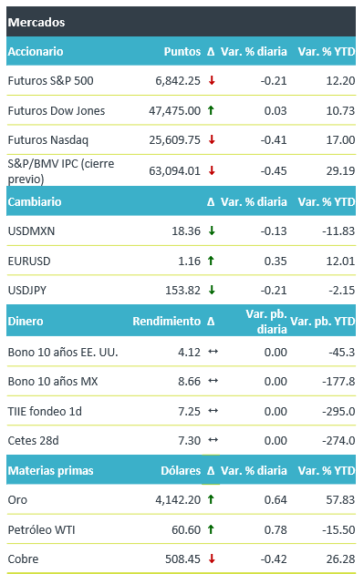 +Anticipamos una jornada volátil, al tiempo que resurgen las preocupaciones relacionadas con las altas valuaciones de empresas tecnológicas. Por otro lado, se mantiene la posibilidad de que el cierre del gobierno estadounidense llegue a su fin, sujeto a que ello sea aprobado por la cámara baja en la votación que pudiera tener lugar hoy. La reapertura del gobierno reactivaría la publicación de datos económicos oficiales y daría un poco de mayor certidumbre respecto a futuras decisiones de política monetaria del Fed.