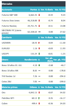 +Los futuros de los índices accionarios operan de forma negativa, después de una jornada anterior complicada, principalmente para compañías relacionadas con la inteligencia artificial. Los índices en Europa (Euro Stoxx -1.5%) operan a la baja; y, en Asia cerraron con retrocesos, destacando que el NIKKEI japonés cayó 3.2%. En materias primas, el oro retrocede en el margen, pero se mantiene estable apenas por arriba de las USD 4,000 por onza. El rendimiento a 10 años de los bonos del tesoro baja, derivado de un mayor apetito por activos seguros. En este contexto, el tipo de cambio se deprecia en el margen, oscilando durante la madrugada entre $18.49-18.43, mientras que el índice dólar baja 0.1%.