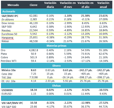 +El precio del petróleo (WTI) bajó 2.1%, finalizando en $59.4 dpb lo anterior como consecuencia de la propuesta de EE.UU. De un plan de paz entre Ucrania y Rusia , el oro presentó un incremento de 0.4% terminando en un precio de $4,082.8 dpb.