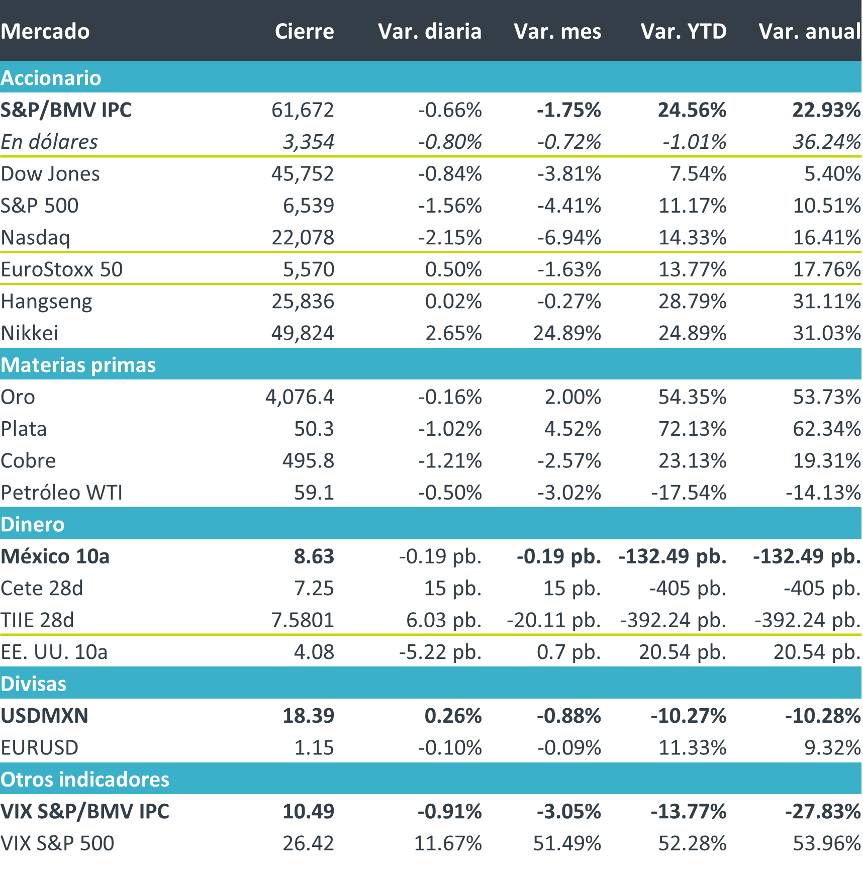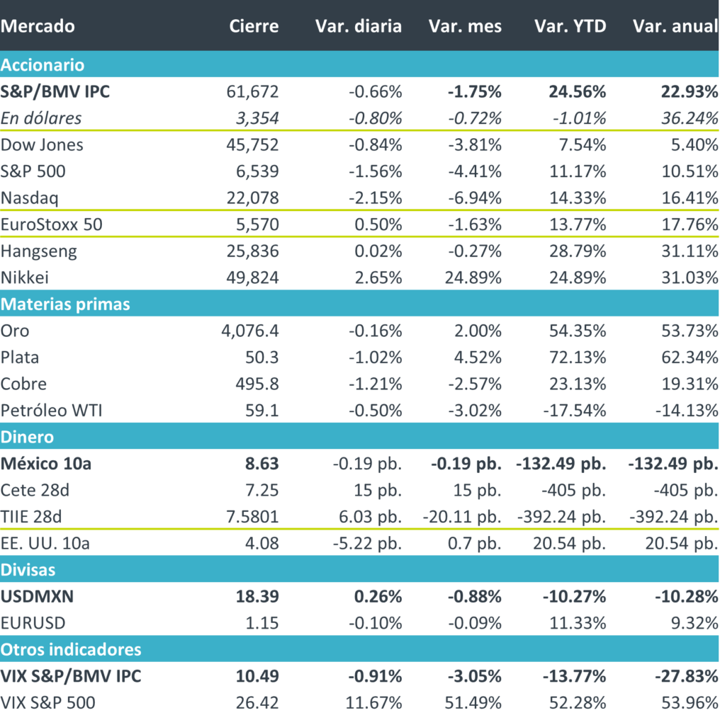 +Por último, el precio del petróleo (WTI) cerró en $59.10 dpb, retrocediendo 0.50%, mientras el oro registró una marginal baja de 0.16% cerrando en 4,076.4 dólares.