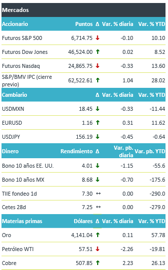 +El precio del petróleo (WTI) subió 1.1%, finalizando en $58.6 dpb, la atención continua concentrada en las negociaciones de paz entre Rusia y Ucrania, el oro presentó un incremento de 0.8% terminando en un precio de $4,164.3 dpb.