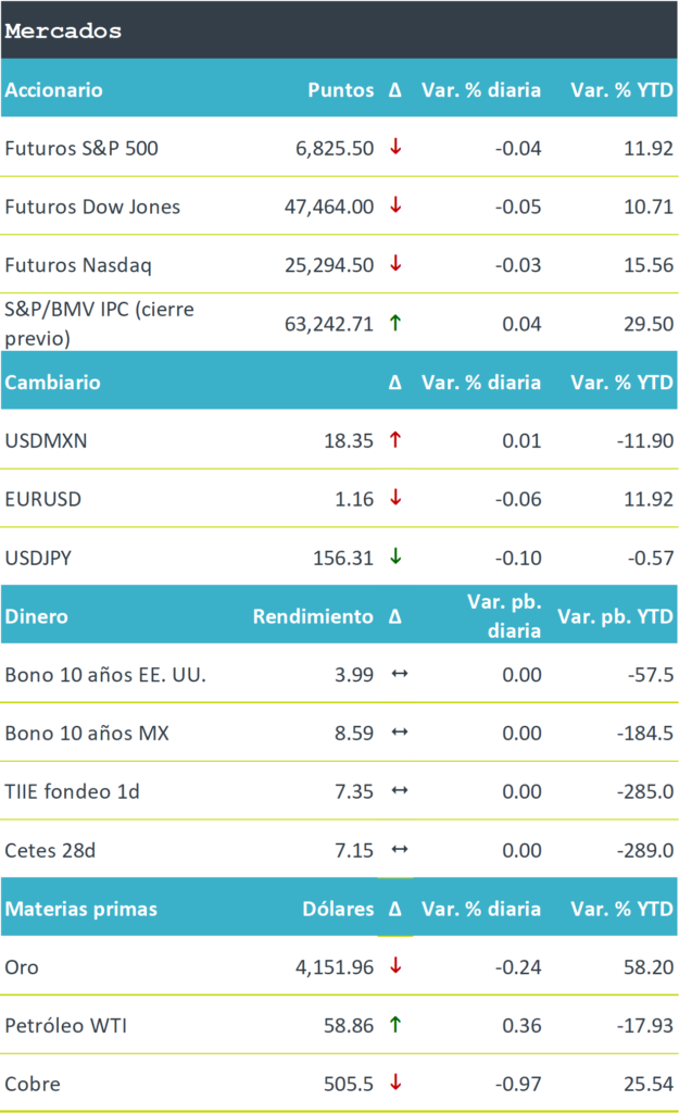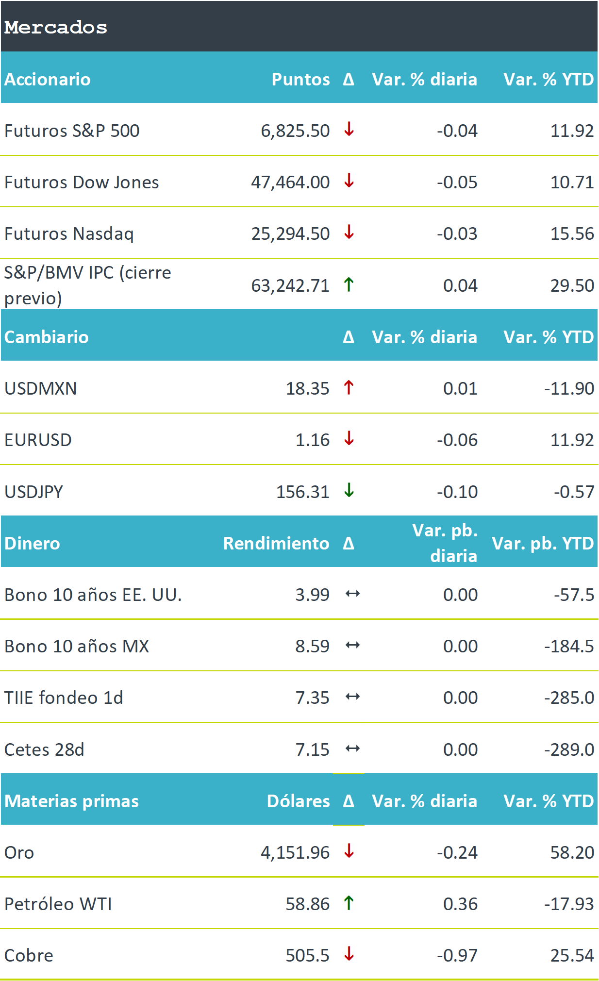 +Los futuros de los índices accionarios estadounidenses operan sin cambios significativos debido al cierre de Wall Street por Día de Acción de Gracias, mientras que los mercados europeos (Euro Stoxx 50, +0.05%) mantienen un tono ligeramente positivo apoyados por expectativas de recortes de tasas del Fed en diciembre. El rendimiento a 10 años de los bonos del tesoro se mantiene estable debido a cierre de mercado de bonos por Día de Acción de Gracias, con rendimiento por debajo de 4.00%. Por su parte, el índice dólar aumenta, aunque marginalmente (0.04%), a medida que las apuestas a favor del recorte en la tasa de los fondos federales por parte del Fed aumentan. Las divisas muestran un comportamiento mixto, aunque mayoritariamente favorable contra el dólar esta mañana. Los precios del petróleo aumentan, al tiempo que se evalúa la posibilidad de un acuerdo de paz entre Rusia y Ucrania.