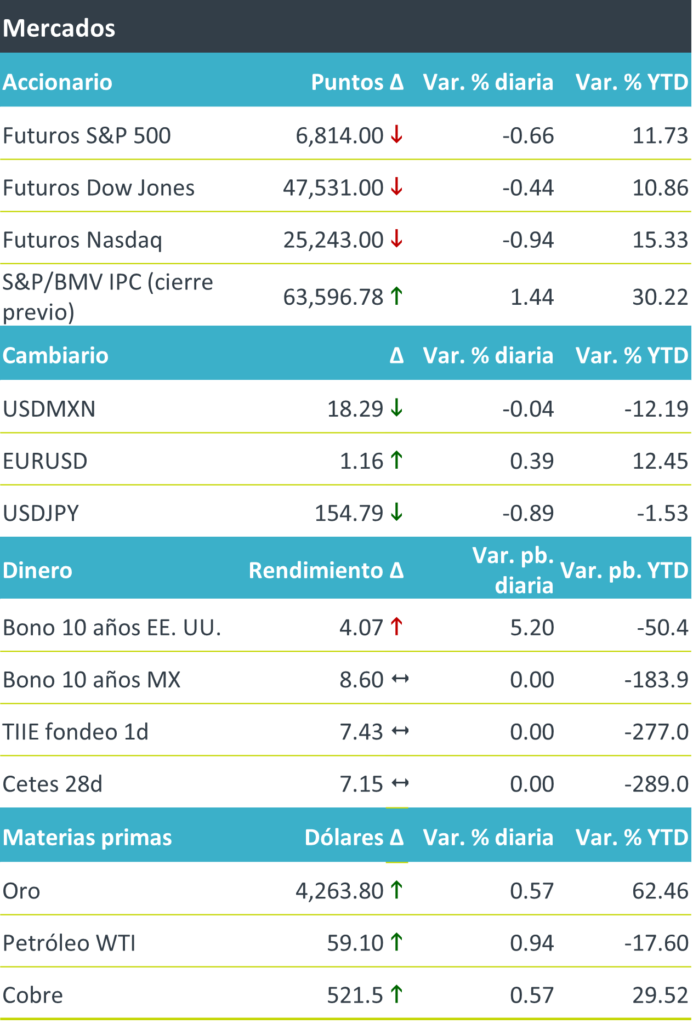 +Después de las ganancias de la semana pasada, alentadas por la expectativa de que el Fed relajará su postura monetaria, esta mañana los futuros de los índices accionarios estadounidenses adelantan una apertura negativa. Esto último, siguiendo las caídas en japón (NIKKEI -1.9%), ante el tono restrictivo de las declaraciones del gobernador del BoJ. Los rendimientos de valores gubernamentales en Europa y los EE. UU. exhiben un aumento generalizado, siguiendo las alzas en Japón (1.86%, +5.8 pb.). Por su parte, el índice dólar se deprecia 0.4%. El yen japonés (+0.9%) lidera las ganancias frente al dólar. El USDMXN presenta ajustes marginales, oscilando durante la madrugada entre $18.27 y $18.31. Los precios del petróleo WTI avanzan después de que se detuviera el flujo de un oleoducto en el Mar Negro, tras ser atacado.