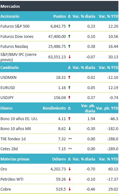 +Anticipamos una jornada volátil, los mercados se encuentran a la espera de datos económicos relevantes en la semana. Así mismo, estarán atentos a las negociaciones entre EE. UU. y Rusia para poner fin a la guerra con Ucrania, lo que potencialmente podría incidir en la cotización de materias primas. En el ámbito local, destacó que la OCDE recorta el pronóstico de crecimiento de México para el 2026 y 2027.