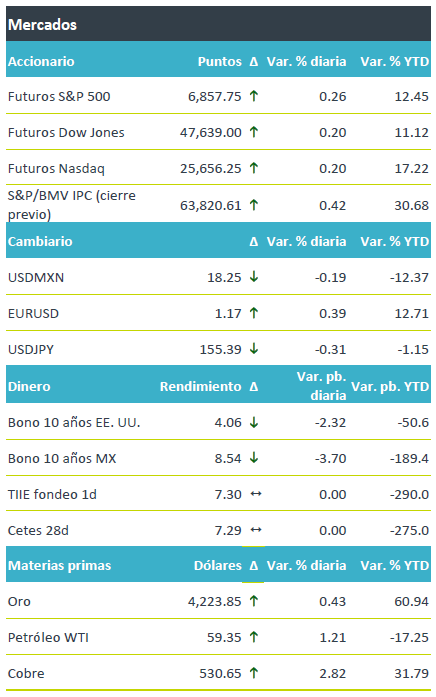 +Los futuros de los principales índices accionarios en EE.UU. continúan con la tendencia positiva de la sesión previa, apoyados por las expectativas de recortes de tasas de interés y optimismo del sector tecnológico. En Europa, los mercados siguen el sentimiento de Wall Street (El Euro Stoxx 50 sube 0.3%), aunque en Asia los índices cerraron mixtos, donde Japón avanzó 1.1% mientras el CSI 300 de China cayó 0.5%. El rendimiento de los bonos a 10 años en EE.UU. corrige parte del alza de las sesiones previas, reflejando las expectativas de otro recorte en tasas por parte del Fed. El USDMXN se ubica en $18.25, alcanzando niveles no vistos desde julio del 2024, mientras el índice dólar (-0.39%) pierde terreno frente a la mayoría de las divisas. Respecto a materias primas, el precio de petróleo WTI reacciona a la falta de avances significativos tras la reunión entre los líderes de Rusia y Ucrania. Por su parte, el oro en línea con la baja en rendimientos de los bonos del tesoro y la debilidad del dólar.
