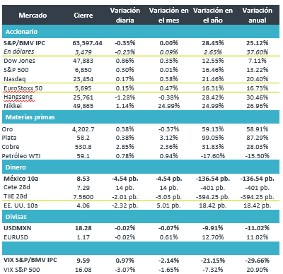 +En el mercado local, el IPC registró una jornada con retrocesos (-0.35%), destacamos el decremento de: AMX (-3.1%), ARCA (-2.2%) y BIMBO (-2.0%).