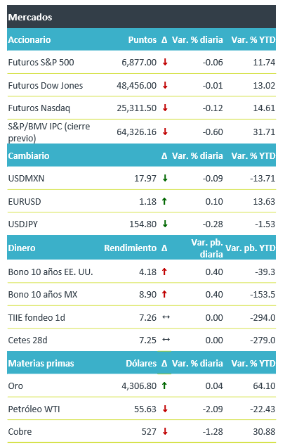 +Los futuros de los índices accionarios operan negativos ante la cautela por el debilitamiento del mercado laboral estadounidense y después de una jornada previa de retrocesos, en donde regresó la preocupación por altas valuaciones en las compañías relacionadas a IA. Los índices en Europa (Euro Stoxx -0.2%) operan a la baja; en Asia cerraron negativos, con el NIKKEI japonés cayendo 1.6%. En materias primas, el crudo retrocede por debajo de los 60 USD por barril, a medida que disminuyen las tensiones geopolíticas; el oro sube en el margen. El rendimiento a 10 años de los bonos del tesoro caen 0.40 pb después de una combinación de ventas minoristas más débiles y una lectura de empleo mixta. En este contexto, el tipo de cambio se aprecia en el margen, oscilando durante la madrugada entre $17.99-17.93, mientras que el índice dólar baja 0.2%.