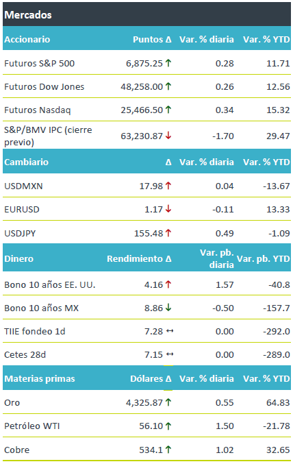 +Los futuros de los principales índices accionarios en EE. UU. rebotan luego de tres jornadas a la baja, en una jornada tranquila donde se esperan comentarios de miembros del Fed. En Europa, los índices operan mixtos (Euro Stoxx 50 -0.1%; FTSE 100 +1.6%), mientras que en Asia los índices cerraron al alza, resaltando el avance de 1.8% de CSI 300 de China. El rendimiento a 10 años de los bonos del tesoro rebota luego de dos sesiones a la baja, previo a que mañana se revele el índice de precios al consumidor. El USDMXN se deprecia pero se mantiene debajo de la barrera de los $18.0, ante el refortalecimiento del dólar, que sube 0.25%. Respecto a materias primas, el precio de petróleo WTI sube ante las sanciones de EE. UU. contra Venezuela, esto luego de que en la jornada previa alcanzara mínimos desde inicios de 2021. Por último, el oro sube 0.55% hasta 4,325 dólares por onza.