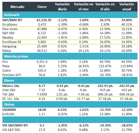 +El precio del petróleo (WTI) subió 2.8%, finalizando en $56.8 dpb, lo anterior por las sanciones de EE.UU contra Venezuela, el oro presentó un incremento de 1.01% terminando en un precio de $4,346.02 por onza.