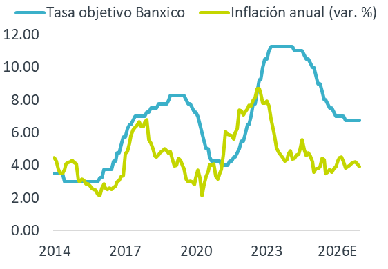 Los retos descritos sobre el panorama inflacionario y el nivel actual de la tasa de interés objetivo implican un estrecho margen de maniobra para la política monetaria. Consideramos poco probable que se materialice el pronóstico de Banxico, en el sentido de que la inflación convergerá en la meta de 3% a partir del 3T26. Así, al tiempo que se pospone la convergencia esperada de la inflación hacia la meta, prevemos que el Instituto realice una pausa en el ciclo de bajas en la tasa de interés al arranque del año. Por otro lado, dado el perfil de la mayoría de la Junta de Gobierno, no descartamos que la tasa referencial sufra un ligero ajuste para consolidarse en terreno neutral, especialmente si efectivamente se diluye el choque inflacionario previsto para el 1T26. Así, estimamos que la tasa de política monetaria cierre entre 6.75 y 7.00%.