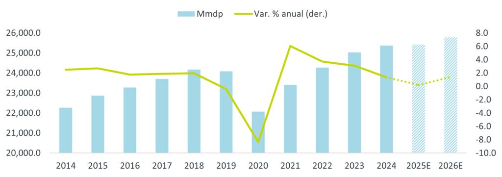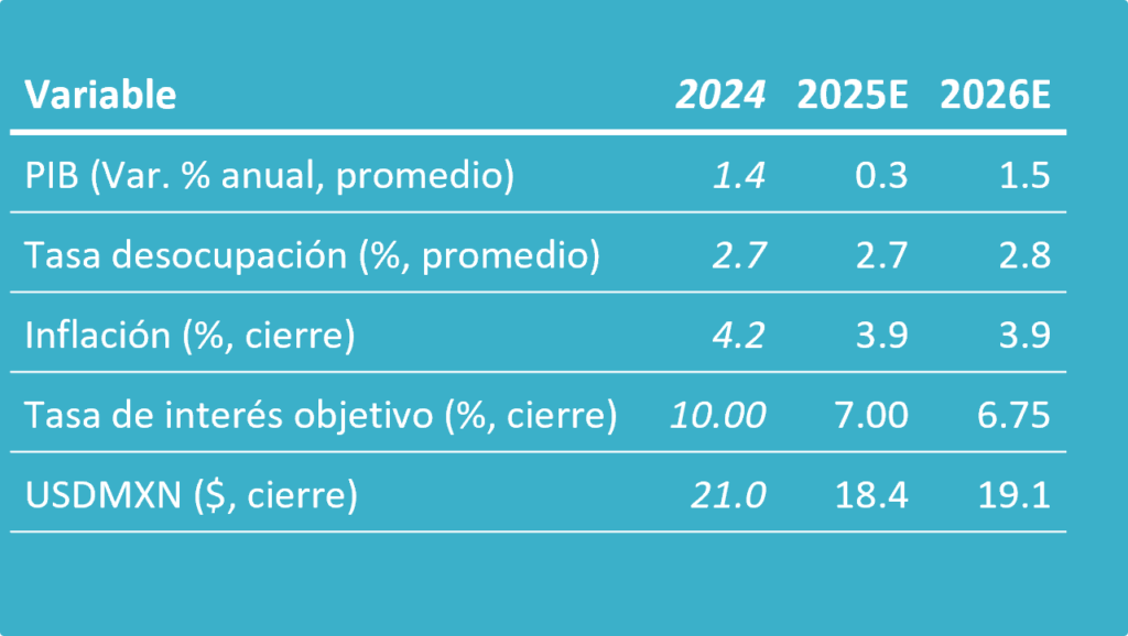 Aunque el próximo año se observará una relativa mejora respecto al del presente, la tasa de crecimiento real del PIB será modesta, quedando debajo de su promedio histórico (1994-2024) de 1.9%. De forma particular, pesarán sobre el crecimiento económico: la restricción en el gasto público para lograr las metas de consolidación fiscal; la latencia de la incertidumbre generada por los cambios en el marco institucional en el país, que limitará el regreso esperado en la inversión, especialmente en sectores no protegidos por el T-MEC; y, una inflación renuente a bajar.