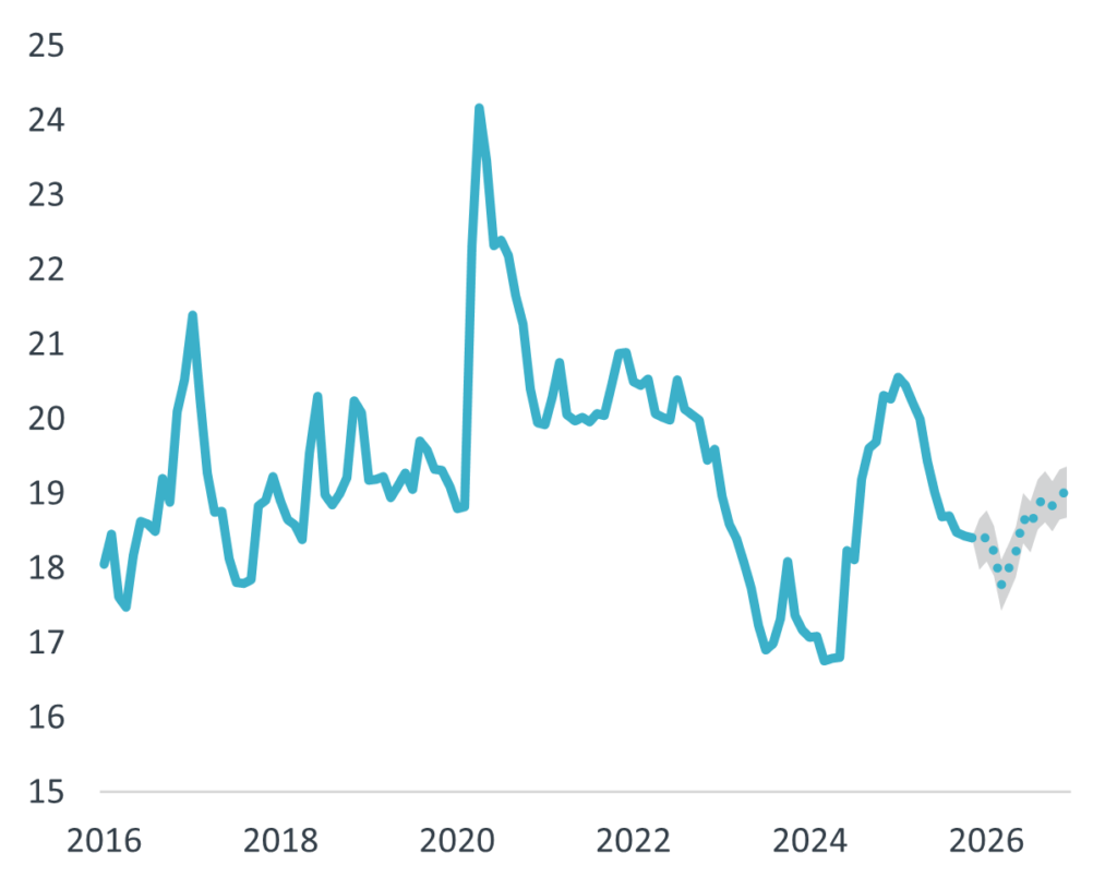 Incorporando lo anterior y los diferenciales de inflación MX-EE. UU., proyectamos que el USDMXN concluya 2026 entre $18.8 y $19.4.