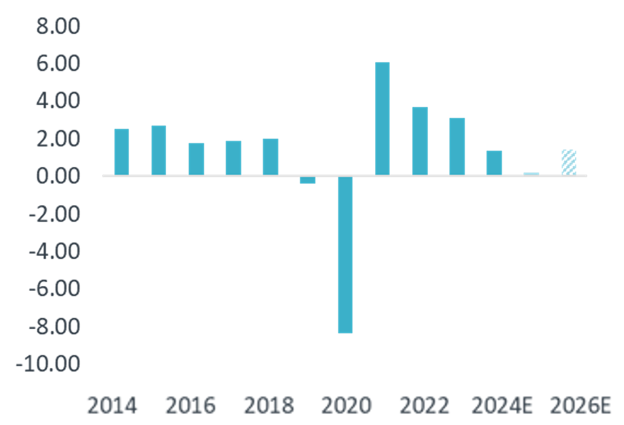 Tomando lo anterior en consideración, pronosticamos un crecimiento real del PIB en 2026 de 1.5%. Si bien, esta tasa de expansión es más alentadora a la de la precuela de 2025, sigue siendo relativamente baja.