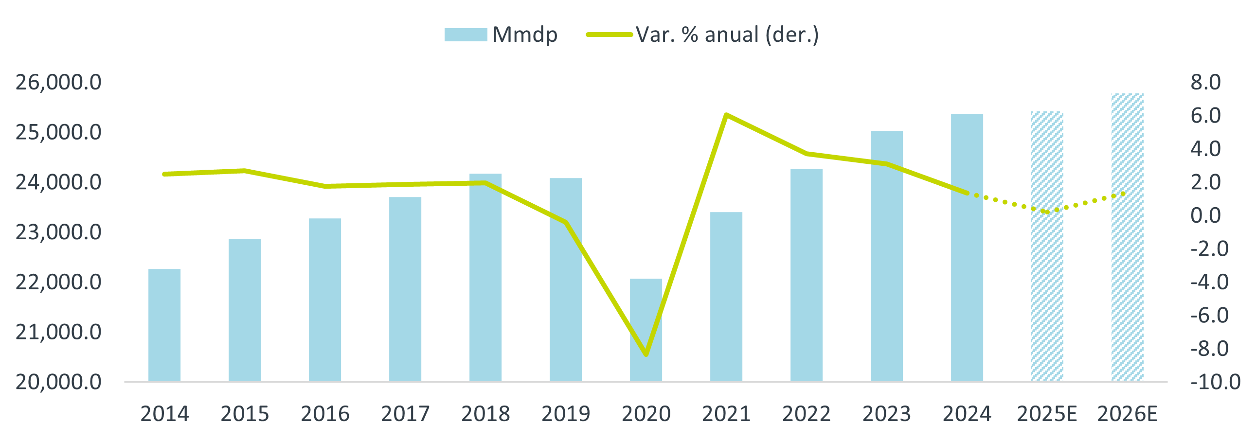 Aunque el próximo año se observará una relativa mejora respecto al del presente, la tasa de crecimiento real del PIB será modesta, quedando debajo de su promedio histórico (1994-2024) de 1.9%. De forma particular, pesarán sobre el crecimiento económico: la restricción en el gasto público para lograr las metas de consolidación fiscal; la latencia de la incertidumbre generada por los cambios en el marco institucional en el país, que limitará el regreso esperado en la inversión, especialmente en sectores no protegidos por el T-MEC; y, una inflación renuente a bajar.