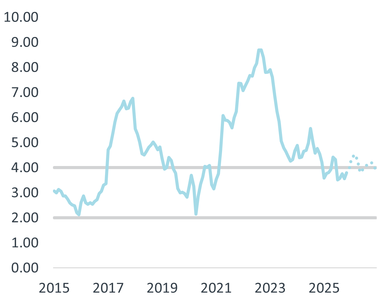 Los retos descritos sobre el panorama inflacionario y el nivel actual de la tasa de interés objetivo implican un estrecho margen de maniobra para la política monetaria. Consideramos poco probable que se materialice el pronóstico de Banxico, en el sentido de que la inflación convergerá en la meta de 3% a partir del 3T26. Así, al tiempo que se pospone la convergencia esperada de la inflación hacia la meta, prevemos que el Instituto realice una pausa en el ciclo de bajas en la tasa de interés al arranque del año. Por otro lado, dado el perfil de la mayoría de la Junta de Gobierno, no descartamos que la tasa referencial sufra un ligero ajuste para consolidarse en terreno neutral, especialmente si efectivamente se diluye el choque inflacionario previsto para el 1T26. Así, estimamos que la tasa de política monetaria cierre entre 6.75 y 7.00%.