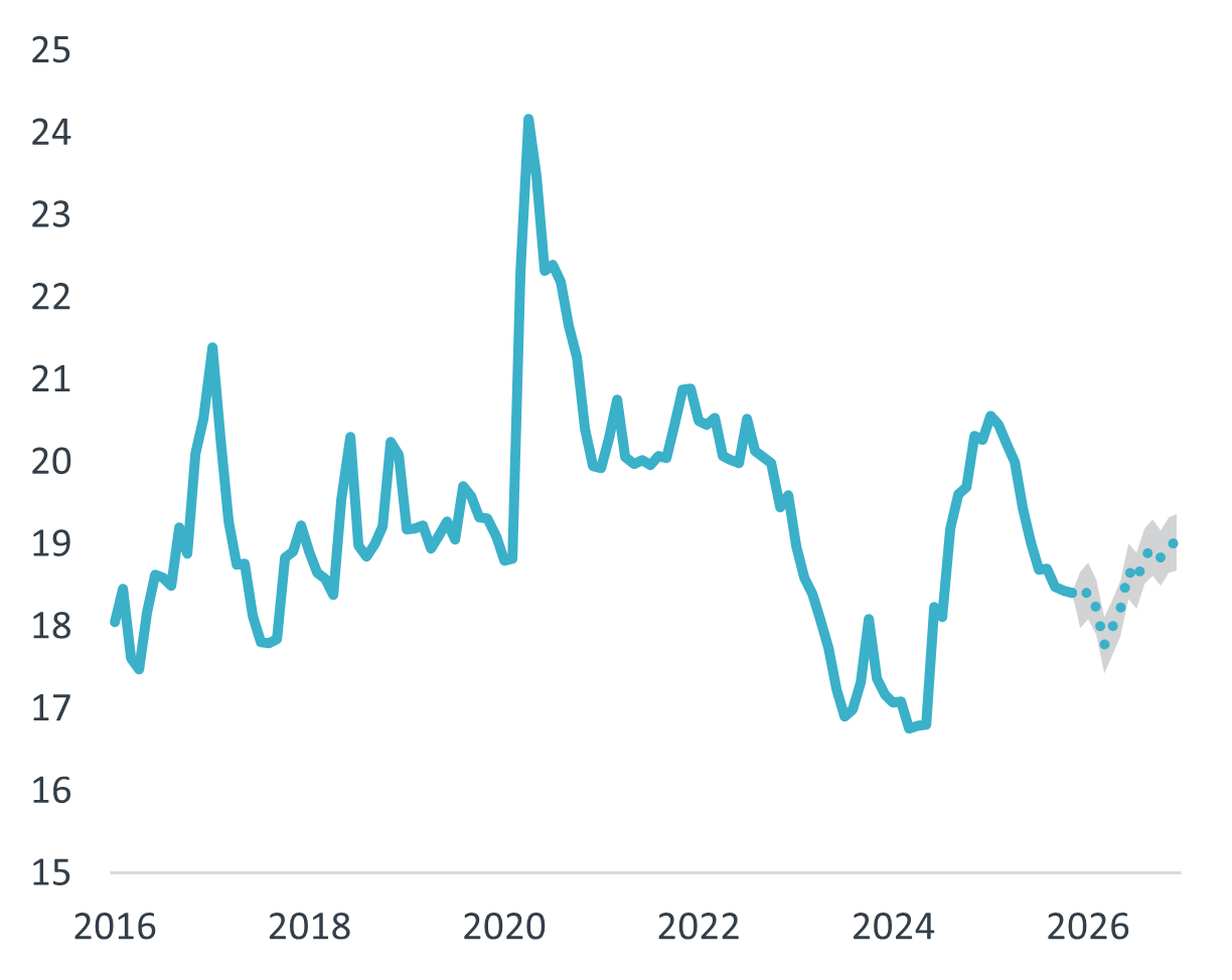 Incorporando lo anterior y los diferenciales de inflación MX-EE. UU., proyectamos que el USDMXN concluya 2026 entre $18.8 y $19.4.