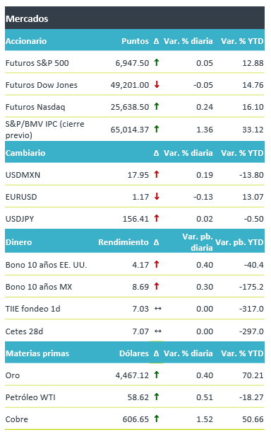 +Los futuros de los índices accionarios operan sin grandes cambios, tras una sesión previa con ganancias, donde destacó el impulso en empresas del sector energético tras la captura del presidente venezolano por fuerzas militares estadounidenses, lo que daría pie a la posibilidad de que empresas accedan a reservas petroleras del país. Los índices en Europa (Euro Stoxx -0.1%) operan también de forma mixta; en Asia cerraron al alza, con el NIKKEI japonés subiendo 1.3%, a pesar de que el Ministerio de comercio de China impuso controles a la exportación de productos de doble uso a Japón. En materias primas, el crudo avanza por segundo día al hilo y el oro sube 0.40%. El rendimiento a 10 años de los bonos del tesoro avanzan en el margen al tiempo que el índice dólar se fortalece ligeramente (+0.2%), después de que un presidente regional del Fed señalara que la política monetaria enfrenta un “delicado balance” entre el mayor desempleo y una elevada inflación. En este contexto, el tipo de cambio se deprecia en el margen, oscilando durante la madrugada entre $17.98-17.97.