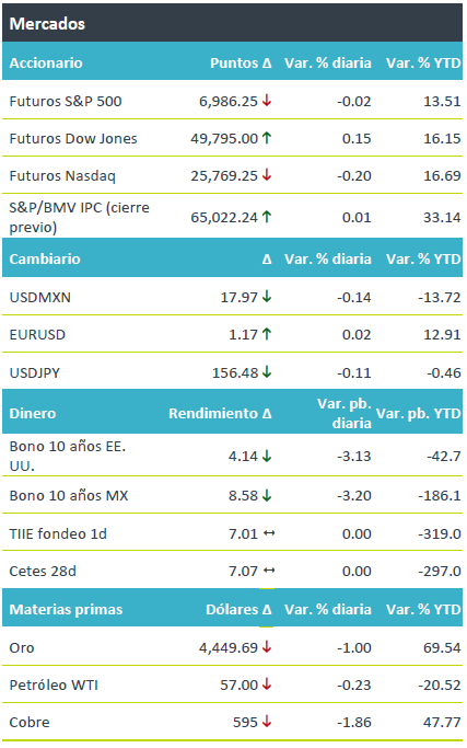 +Los futuros de los principales índices accionarios en EE.UU. presentan movimientos mixtos, luego de que ayer alcanzaran nuevos máximos históricos. En Europa, los mercados operan negativos (El Euro Stoxx 50 cae -0.1%), ante las preocupaciones geopolíticas y las cifras de inflación en la Eurozona. En Asia los índices cerraron con caídas, luego de que China anunciara su investigación de diclorosilano importado de Japón. El rendimiento de los bonos a 10 años en EE.UU. baja ante el incremento en el sentimiento de aversión al riesgo en los mercados financieros y siguiendo los retrocesos de los rendimientos en Europa, explicados por cifras de inflación favorables. El USDMXN se aprecia hasta $17.97 ya que el dólar se debilita ligeramente frente al euro y el yen japonés. Respecto a materias primas, el precio de petróleo WTI retrocede ante los comentarios del presidente Trump sobre el petróleo de Venezuela, por su parte, el oro baja 1.0% en una toma de utilidades luego de tres sesiones al alza.