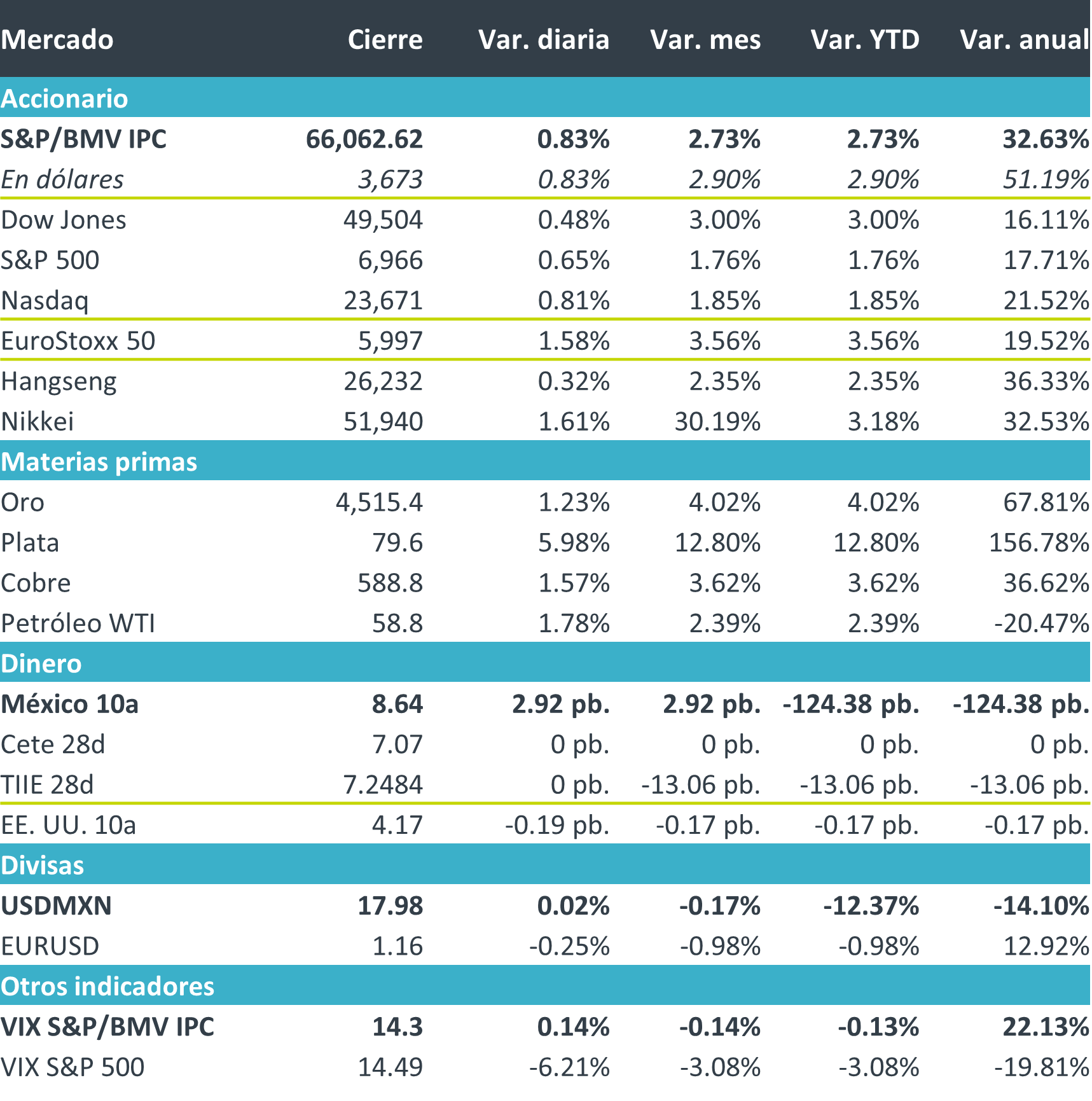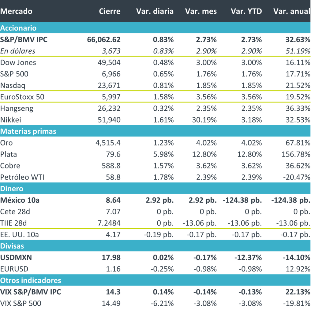 +Los principales índices de EE. UU. cerraron la primera semana completa del año al alza. La recalibración sectorial iniciada en la jornada previa continuó, llevando a las empresas de baja capitalización a máximos históricos y permitiendo que el S&P 500 alcanzara por primera vez en el año su pico. El reporte de empleo en EE. UU. reforzó las apuestas de que la Fed mantendrá la tasa este mes, al mostrar un mercado laboral que, aunque se enfría, permanece estable y resiliente. Las acciones retrocedieron momentáneamente por el tema de la Corte Suprema, pero luego retomaron el avance con un liderazgo más amplio, no limitado a las firmas de gran capitalización.