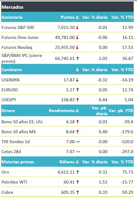 +Los futuros de los índices accionarios operan a la baja, ya que el mercado continúa asimilando la investigación criminal que involucra al presidente de la Reserva Federal –que generó ansiedad y preocupación por la independencia del banco central– y algunos eventos geopolíticos relevantes, si bien han ido pasando a segundo plano. Cabe destacar que los futuros recortaron sus pérdidas tras conocerse el índice de precios al consumidor. En Europa se percibe un tono marginalmente positivo (Euro Stoxx 50 +0.2%) y en Asia los índices cerraron mixtos (NIKKEI japonés +3.1%). El oro sigue siendo favorecido como activo de refugio. El petróleo también después de un incidente con un buque petrolero en el Mar Negro y la continua tensión iraní. El rendimiento a 10 años de los bonos del tesoro moderaron sus presiones alcistas, asimilando el dato de inflación de esta mañana, y el índice dólar rebota apenas 0.1%. El tipo de cambio se aprecia en el margen, oscilando durante la madrugada entre $17.90-17.93.