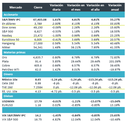 +En el mercado local, el IPC registró una jornada con avances (1.61%), destacamos el incremento de: GFNORTE (+5.2%), ARCA (+4.2%) y GMEXICO (+4.0%).