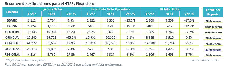 REGIONAL. Para el 4T25 se estima un incremento de 27.8% a/a en margen financiero, ante una mayor captación de cuentas a nivel regional, mientras que se proyecta que el resultado operativo aumente 6.6% y la utilidad neta mejore un 6.7% a/a.