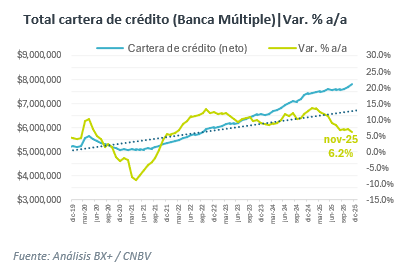Sistema financiero. La cartera de crédito neto de la Banca Múltiple continúa con la tendencia de desaceleración de meses previos. Para noviembre, la cartera aumentó 6.2% a/a, acumulando 6 meses de crecimiento de un solo dígito, en respuesta a una elevada base de comparación, y enfriamiento económico. A tasa mensual, la cartera de crédito avanza marginalmente, en promedio 0.65% en la segunda mitad del 2025. Cabe mencionar que el crecimiento anual se encuentra ligeramente alejado de la guía de los grandes grupos financieros que era de 8%-11% para el año.