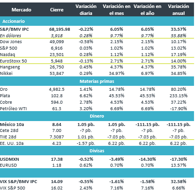 +En el mercado local, el IPC registró una jornada con retrocesos (-0.22%), destacamos el decremento de: TELEVISA (-2.4%), GAP (-2.4%) y CUERVO (-2.3%) *datos preliminares.