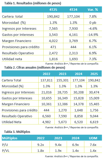 2025. Así, el grupo financiero terminó el año con un crecimiento en margen financiero de 7.6% a/a, apoyado por una reducción de 5.2% a/a en gastos por intereses, mitigado por un aumento de 6.6% a/a en provisiones de crédito y generando una expansión de solo 1.5% en utilidad neta en el año.