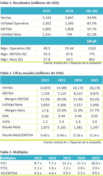 - Récord en 2025. La empresa reportó un incremento en ventas de 34.0% a/a y de forma anual incrementó 17.5% a/a, principalmente por un aumento en volúmenes de ventas de molibdeno, plata y zinc, aunado al avance en el precio del cobre y otros metales. Lo anterior fue parcialmente contrarrestado por la caída en ingresos de la división infraestructura.
