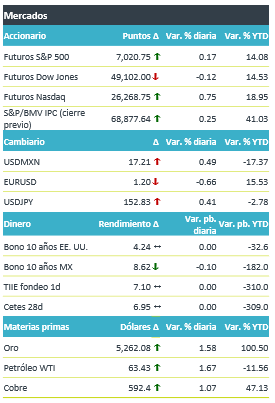 +Esperamos nuevamente una jornada impulsada por el sector tecnológico, donde la temporada de reportes trimestrales y la expectativa de sólidos resultados de las firmas de megacapitalización parecen respaldan los fundamentales de las empresas. Además, el mercado ha descontado que el Fed mantenga sin cambios la tasa de interés de referencia en el rango de 3.5-3.75% en su anuncio de política monetaria de hoy, sin embargo, pondrán especial atención a la conferencia del presidente J. Powell, en el contexto de presiones políticas sobre el banco central. Por último, los inversionistas observan el comportamiento de dólar y cómo favorece a las materias primas.