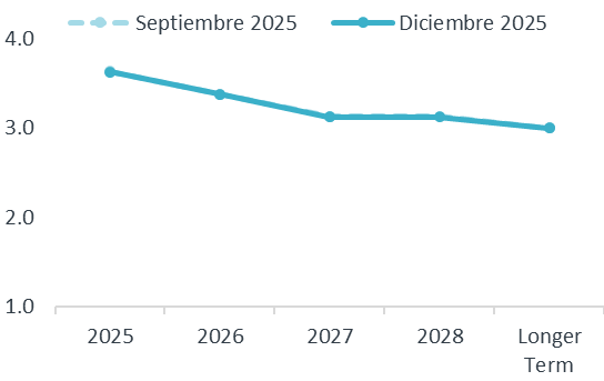Gráfica 1. Mediana de proyección tasa objetivo, FOMC (%)