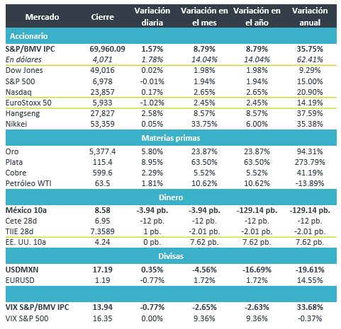 +El precio del petróleo (WTI) subió 1.8%, finalizando en $63.5 dpb, derivado de la intensificación del problema entre Irán y EE.UU., el oro presentó un incremento de 5.8% terminando en un precio de $5,377.4 por onza, la ola de aversión al riesgo continúa impulsando el precio del metal.