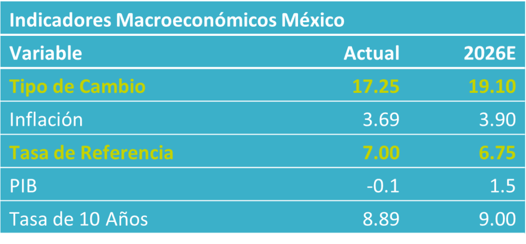Ya entrado 2026, la revisión del T‑MEC detonaría recuperación parcial de inversión y empleo, particularmente en el Norte, la cual también se beneficiaría de la expectativa de una mayor estabilidad económica en los EE. UU. Por su parte, la celebración de la Copa Mundial de futbol impulsaría a los servicios vinculados al turismo, con mayor efecto en la región Centro.