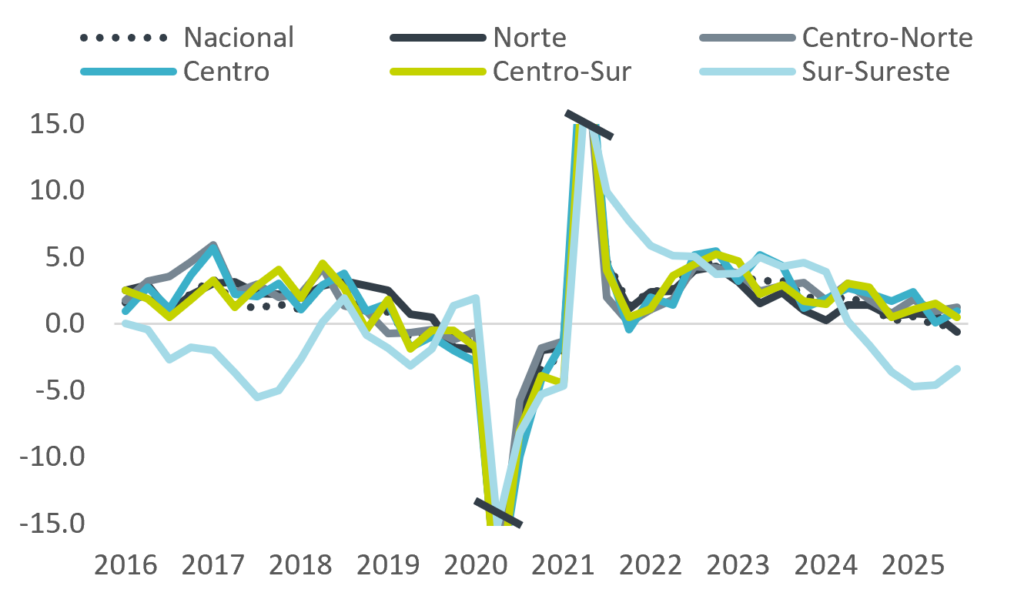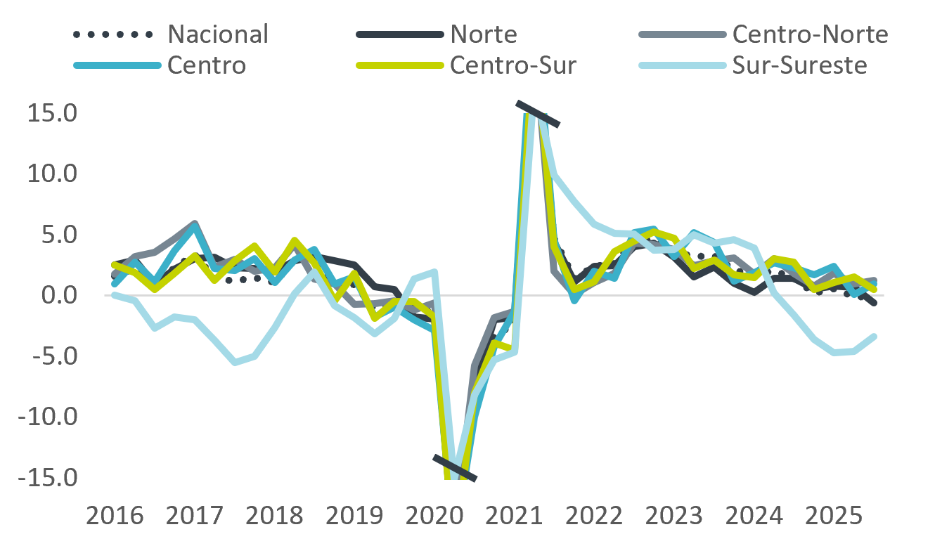 - Implicación: El panorama difiere de manera regional. En la zona Norte se espera un bajo dinamismo en el corto plazo hasta que no se reacelere la actividad económica y se disipe la incertidumbre comercial en los EE. UU. Sur-Sureste puede extender su rezago, afectada por la baja extracción de crudo y la menor inversión pública, si bien en 2026 enfrentará una base comparativa menos difícil. El Centro podría beneficiarse por lo que parece ser una mejora en la inercia del consumo privado.