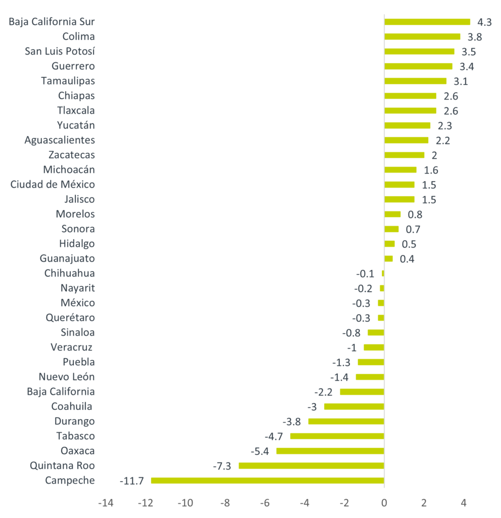 - Relevante: El dinamismo económico continuó concentrándose sobre todo en las regiones del Centro/Centro-Sur (Tlaxcala y Zacatecas); mientras que el Sur-Sureste mantuvo una importante caída interanual (Campeche, Quintana Roo y Oaxaca), en parte, sufriendo por los efectos de una menor inversión pública.
