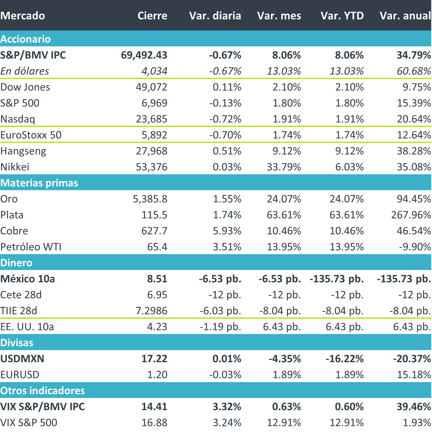 +Se registró una jornada volátil, en la que volvió a permear el sentimiento de escepticismo en el sector de la IA,, impulsado por mayores inversiones y una monetización menos clara o menos inmediata por parte de Microsoft el cuál sufrió su mayor caída desde 2020. Posteriormente, el ánimo de comprar a este mismo precio bajo sostuvo parcialmente los índices, junto con la ampliación del liderazgo/rotación o diversificación que ha caracterizado este primer mes del año hacia sectores más ligados a la economía real. Inversionistas comentan que, si bien se espera seguir viendo ganancias, este año prevalece una mayor cautela y la estrategia es elegir cuáles serán los que aporten ese crecimiento.