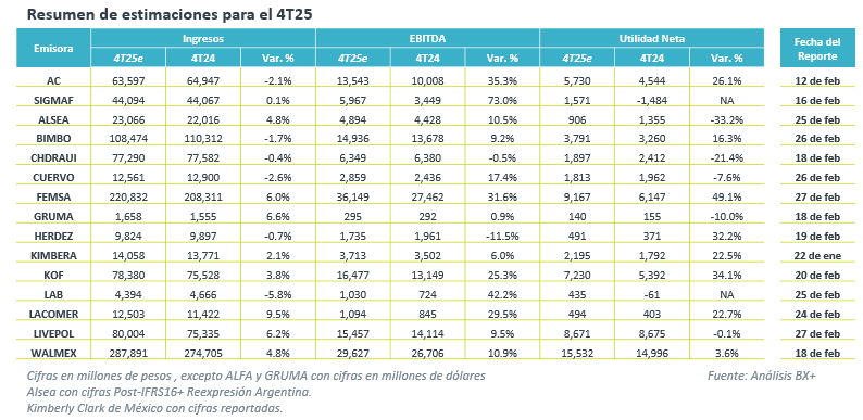 Cuervo. Para el 4T25, la empresa continúa enfrentándose a las tendencias de la industria, mayormente por la debilidad de EE.UU., además resaltan los cambios en distribuidor. Mientras que en México, se espera un trimestre menos volátil y mejoras en eficiencia de inventarios. Por lo anterior, podríamos esperar un volumen aún presionado, y por tanto se estima con ligero decremento de 2.6% a/a en ingresos, con un aumento de 17.4% a/a en EBITDA por el efecto favorable de los precios del agave, pero una caída de 7.6% a/a en utilidad neta.