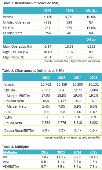 - Perspectiva Neutral. Esperamos una implicación de neutral a positiva, ya que el reporte presentó cifras mixtas, pero la guía 2026 presenta un incremento de un dígito alto en EBITDA.