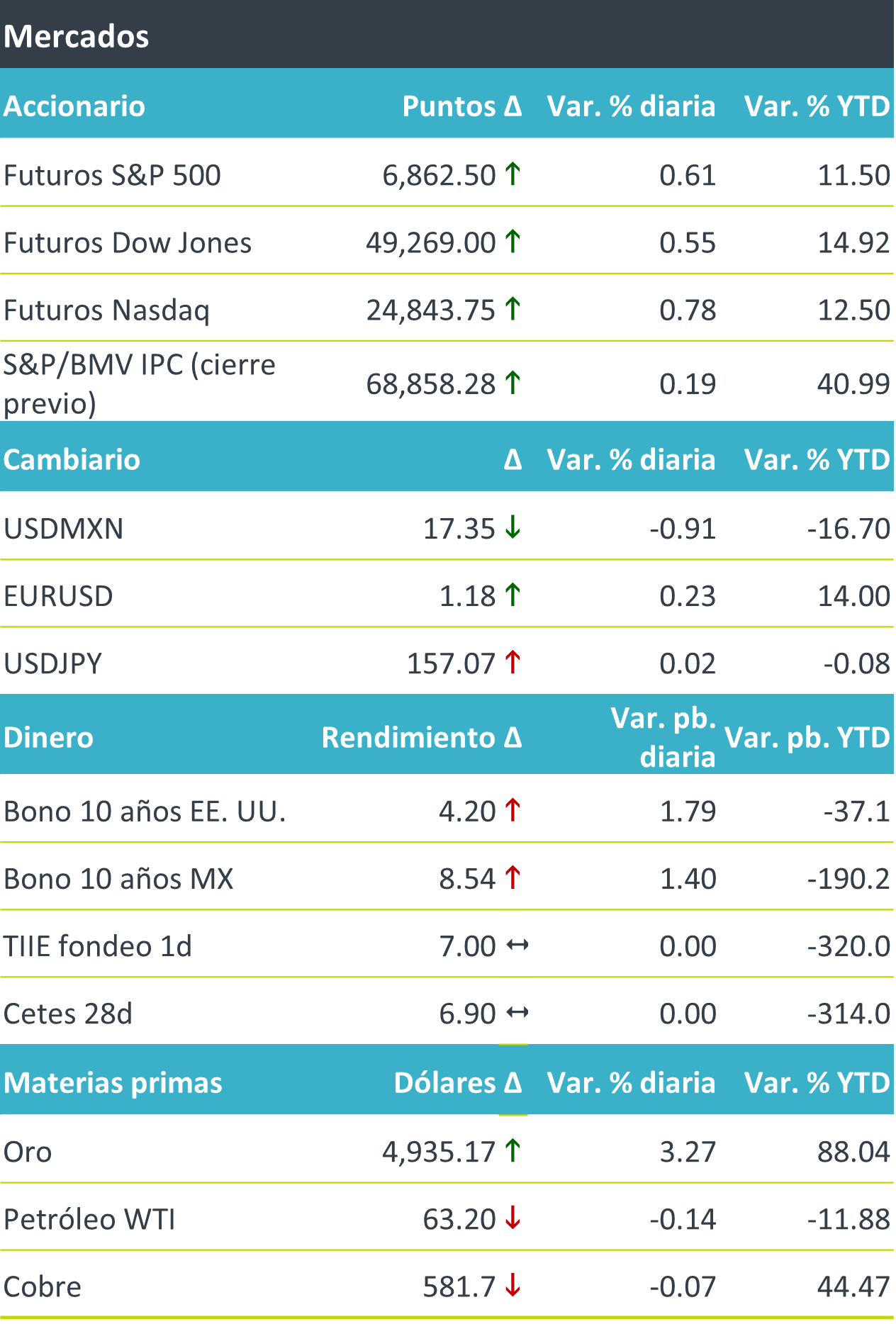 +Los futuros de los índices estadounidenses operan al alza al arranque de la jornada, impulsados por compras de oportunidad, aprovechando la baja de las tres sesiones previas. En renta fija global, el rendimiento del bono del tesoro a 10 años avanza marginalmente, reflejo del riesgo de un menor control monetario y fiscal en el mediano plazo. En divisas, el dólar se debilita marginalmente (DXY -0.08%), mientras que el USD/MXN se aprecia en línea con demás monedas emergentes, frente a un mercado que muestra apetito por riesgo por la mañana. En materias primas, el crudo inicia la sesión a la baja en línea con las correcciones generalizadas a la apertura, buscando eliminar su avance de ayer, catalizado por las anunciadas posibles reuniones entre el Gobierno de Irán y el de EE. UU. El oro y la plata operan al alza, recuperándose tras la venta generalizada que permeó en todo lo que había mostrado recientemente un buen desempeño en el año en curso, como es el caso de los metales preciosos.