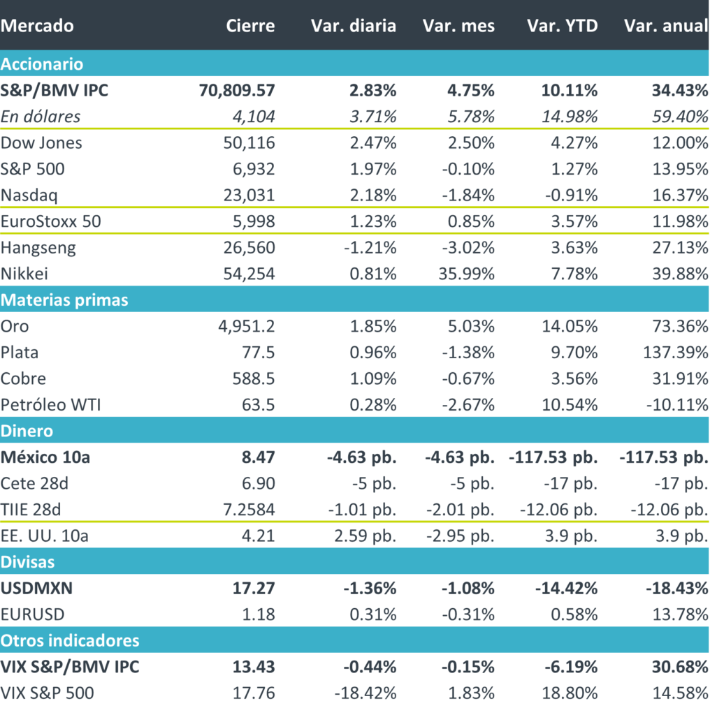 +Fue una jornada de rebote para los mercados: tras las ventas generalizadas de las tres sesiones previas, las acciones tuvieron su mejor día desde mayo de 2025. Los inversionistas catalogaron las caídas anteriores como un gran recalibramiento para despejar el ruido en el sector de la IA, más que como una fisura fundamental, apoyados en la posición macroeconómica estable actual. A esta euforia de comprar a descuento y recuperar lo perdido en la semana se sumó el dato positivo de confianza del consumidor, que alcanzó su nivel más alto en seis meses en EE. UU., alimentando el apetito por riesgo y las subidas generalizadas.