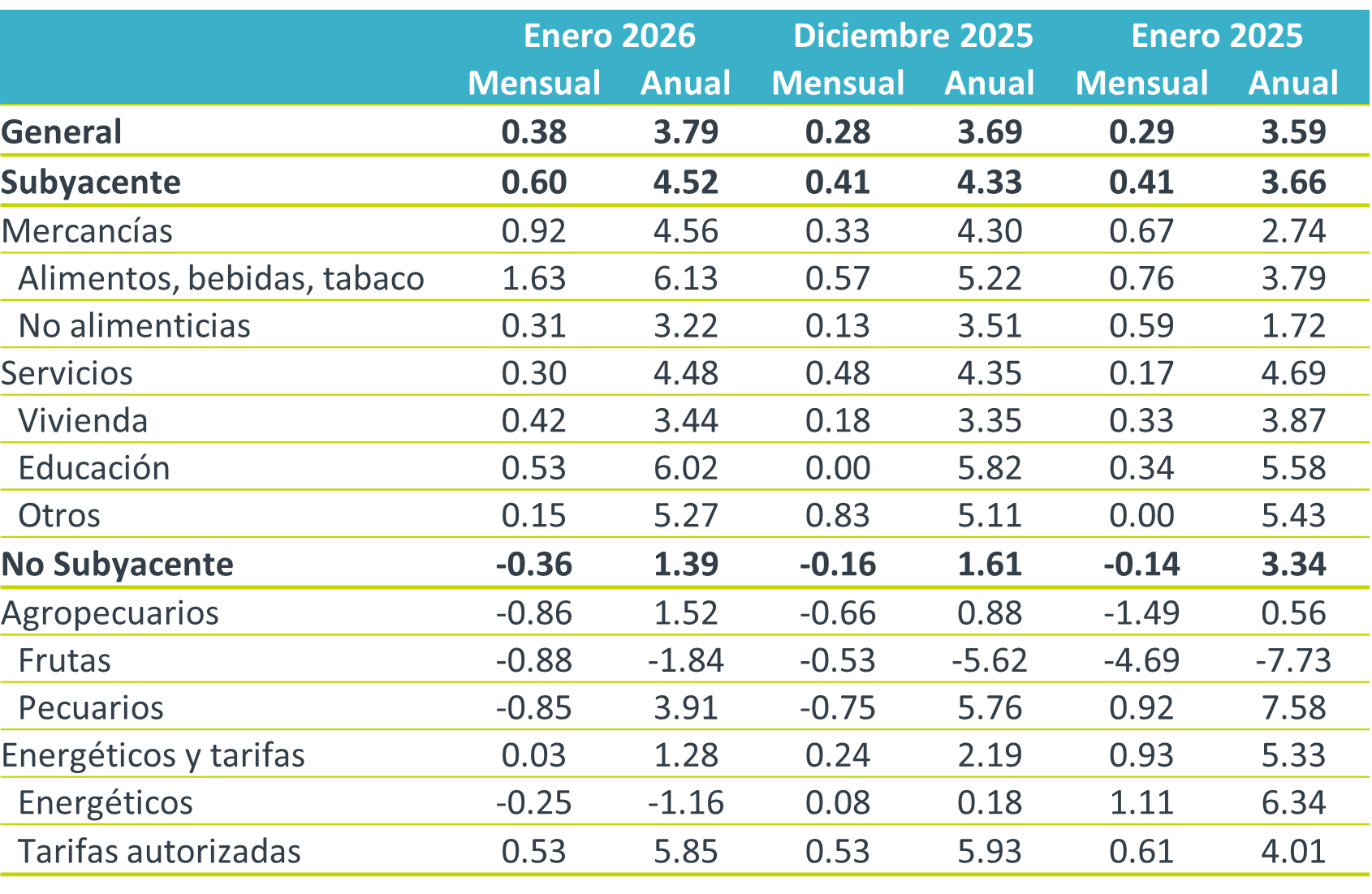- Noticia: La inflación al consumidor durante enero creció 3.79% a tasa anual, apenas debajo del 3.82% previsto por nosotros y el consenso. El índice subyacente* se expandió 4.52%, trivialmente encima de nuestra previsión (4.51%).