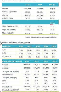 Valuación. Durante el 2025 el Flujo libre de efectivo cubrió MXN$45.1 miles millones en distribuciones a accionistas y una reducción de deuda de MNX$20 miles de millones, con lo anterior el ratio de apalancamiento presentó una mejora, pasando de 2.23x en 2024 a 1.93x. Recalcamos que la compañía incrementó su ROE de 7.6% al final del 2024 a 22.9% al cierre del 4T25. En múltiplos presenta un descuento de 15.2% en P/U.