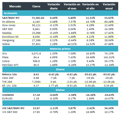 +El precio del petróleo (WTI) subió 1.69%, finalizando en $65.0 dpb, lo anterior a pesar de que la OPEP estima una caída en la demanda y con el incremento en tensiones geopolíticas, el oro presentó un incremento de 1.3% terminando en un precio de $5,071.6 por onza.