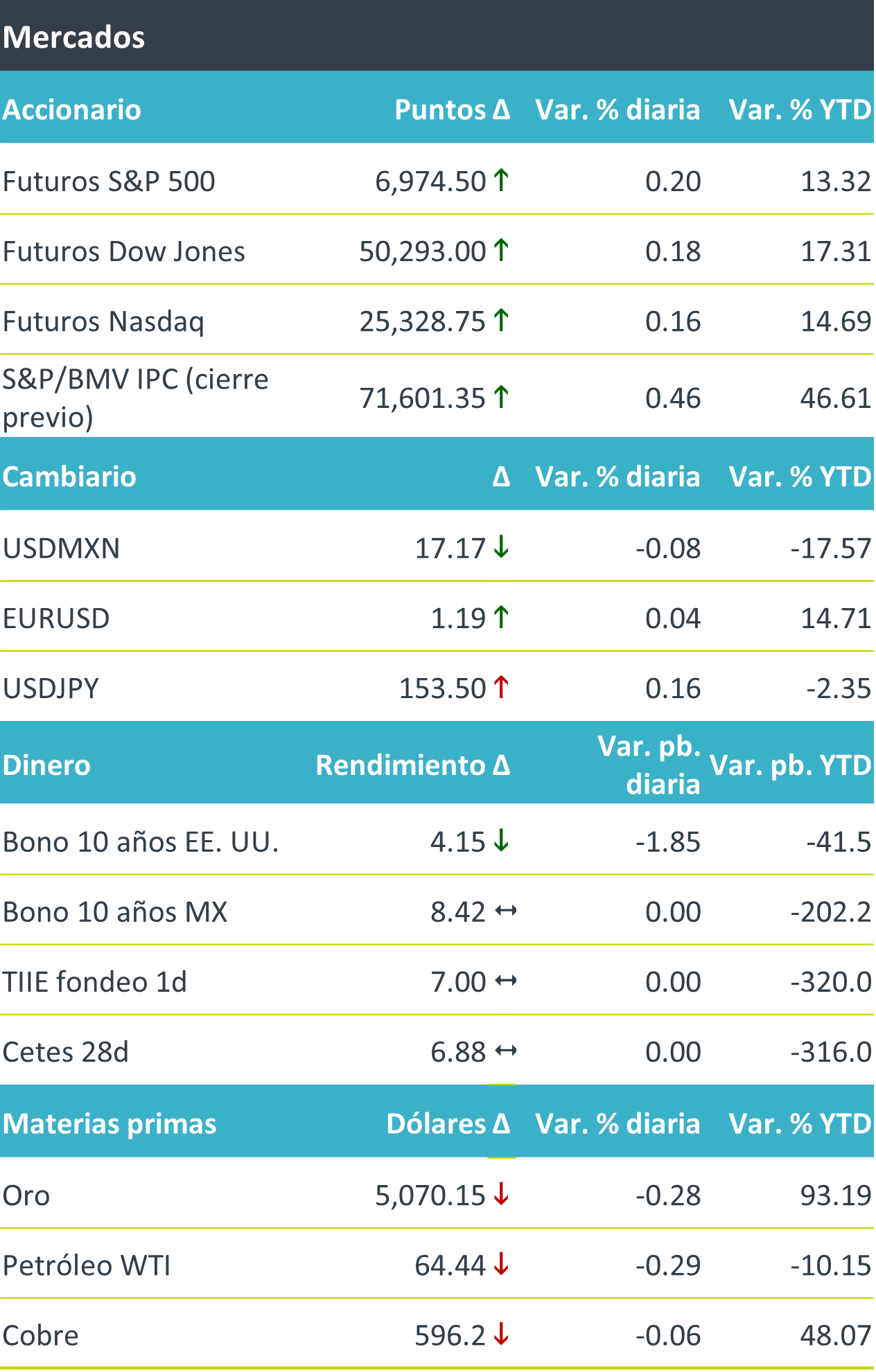 +Los futuros de los principales índices accionarios en los EE. UU. avanzan luego del dato de empleo del día de ayer, con un registro mucho mejor al esperado, incrementando así el apetito por riesgo. En Europa, los mercados operan al alza (Euro Stoxx 600 +0.3%), impulsados por sólidas ganancias de empresas como Siemens y EssilorLuxxotica. En Asia, los rendimientos accionarios avanzan por quinto día consecutivo. El rendimiento de los bonos a 10 años en EE.UU. cae, ante el posicionamiento defensivo del dato de CPI de enero que se publica mañana, devolviendo parte de la presión que causó el fuerte dato de empleo del día de ayer. El USDMXN avanza ligeramente frente al dólar; mientras que el índice dólar por su parte se coloca prácticamente estable, apoyado por el sólido dato de nóminas que redujo expectativas de recorte del Fed. Respecto a materias primas, el precio de petróleo WTI baja 2.2% a en parte por la previsión de la OPEP de una caída en la demanda de crudo, y esperando noticias nuevas sobre Irán; mientras, el oro disminuye, ajustando con respecto a la semana anterior de ganancias históricas.
